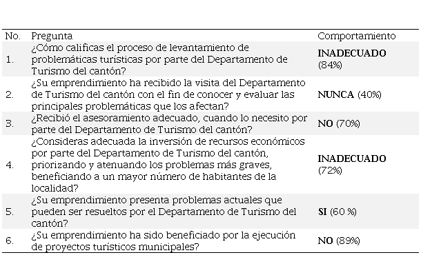 Con el objetivo de evaluar la infraestructura del territorio y poder identificar las relaciones que se establecen entre todos los actores turísticos se realizó una encuesta a los diferentes actores turísticos desde la municipalidad hasta los emprendedores turísticos y la comunidad, se determinó el tamaño de la muestra partiendo de tener un universo infinito y estimándose un margen de error del 6% (d=0,06), la encuesta se centra en evaluar la gestión turística local, se aplica un total de 267 encuestas, las preguntas se dirigen a identificar el nivel de satisfacción con el desarrollo de la actividad turística dentro del territorio y conocer el grado de relación e interacción entre instituciones relacionadas de forma directa e indirecta con el turismo en el cantón Bolívar. Los resultados se muestran en la tabla 2.