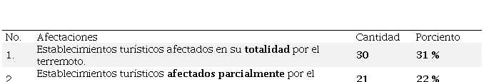 El terremoto no afecto estos centro de alojamiento turístico, sin embrago los centros que ofrecen servicios de restauración si muestran daños en su estructura, se evidenció una alta afectación por su colapsó en los siguientes restaurante: La Olla, Asadero su mejor pollo, Domingo criollo, Doña Meche y a la Asociación de Bares y Restaurantes del mercado central, que disminuyen la oferta en 200 plazas que representa un 53% de afectación de algún tipo a estos emprendimientos, en la tabla 3, se muestra un resumen estadístico de las afectaciones.