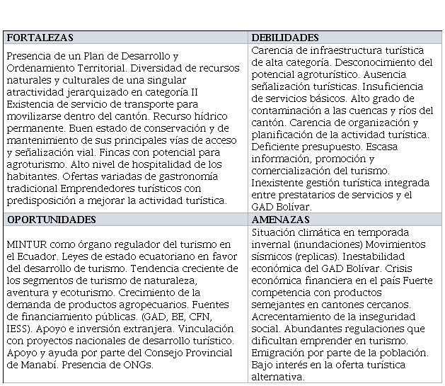 El diagnóstico turístico situacional nos presentó un estancamiento en la gestión turística del cantón Bolívar, agravada por el terremoto del pasado 16 de abril de 2016, se evidencia daños en el sistema turístico, en sus atractivos turísticos, en los establecimientos de alojamiento, gastronomía y actividades turísticas, crece la actividad turística informal, escasa información, promoción y comercialización.