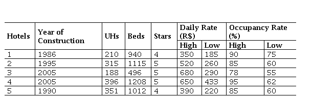 It is observed that all the hotels included in the survey were built in the 1990s, which the exception of one, which was built of the 1980s. Thus, they were built when the environmental theme was already in vogue. These are large-scale enterprises with between 188 and 396 AUs, daily rates of between R$188 and R$680, and occupation rates ranging from 55% to 95%, depending on the season. Two of the establishments were hotels and three were resorts. The other types of accommodation establishments were not identified.