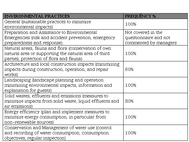 It was also verified that not all the establishments practiced solid waste management. The architecture and the impacts of local construction were mentioned by 60% of the interviewees, and landscaping was applied by all the enterprises surveyed.