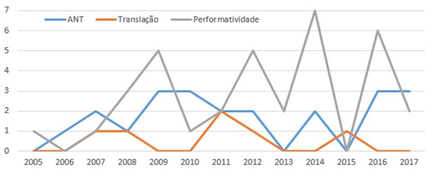 E com relação aos termos voltados à performatividade, em vários periódicos nacionais e internacionais aparecem associados ao desempenho econômico. Dessa maneira, quando os conceitos-chave da TAR são apresentados com outro sentido, além daqueles discutidos nas subseções anteriores, os artigos não foram considerados, o que demandou uma análise prévia dos dados para entender se esses devem ou não compor a amostra da pesquisa.