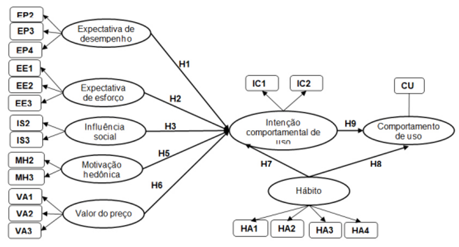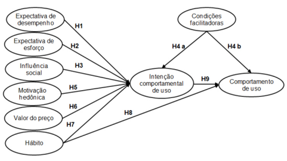Outrossim, os construtos Expectativa de Desempenho, Expectativa de Esforço, Influência Social e Condições Facilitadoras continuaram como influenciadores da Intenção Comportamental, juntamente com a Motivação Hedônica, o Valor do Preço e o Hábito. O construto Condições Facilitadoras ganhou uma nova relação e influencia também o Comportamento de Uso, juntamente com o Hábito e a Intenção Comportamental.