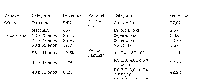Para a caracterização da amostra, foram utilizadas as variáveis: gênero, faixa etária, estado civil e renda familiar, conforme Tabela 2.
