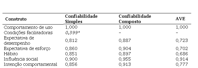 Em relação à confiabilidade, o construto Condições Facilitadoras apresentou valor relativo ao Alpha de Cronbach inferior a 0,70, limite mínimo sugerido na literatura (Hair Jr et al., 2016), desse modo foi excluído do modelo. Todos os demais construtos obtiveram valores dentro do esperado nesse quesito. Valores satisfatórios também foram encontrados nos resultados referentes à confiabilidade composta, conforme exposto na Tabela 3.