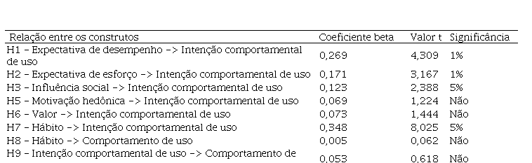 É interessante destacar que o construto Hábito, constatado como o preditor mais forte na relação com a Intenção Comportamental, não apresenta relação significativa com o construto Comportamento de Uso (H8). Isto é contrário ao que sugerem pesquisas anteriores que apontam o hábito com efeito direto do Comportamento de Uso da tecnologia (Venkatesh et al., 2012).