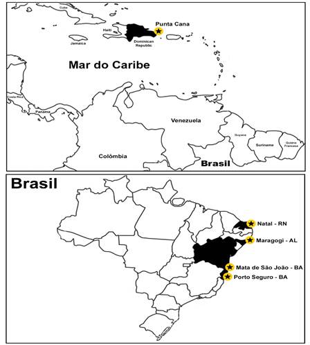 A localização destes resorts está disponível na Figura 1. Conforme mencionado anteriormente, em função das escolhas metodológicas ligadas ao número maior de OTRs, os resorts estão localizados em Punta Cana, na República Dominicana, e no nordeste brasileiro nas cidades de Maragogi – AL, Natal – RN, Mata de São João – BA e Porto Seguro – BA. Desta maneira, a Figura 1 retrata a localização destes pontos no Brasil e na região do mar do Caribe.