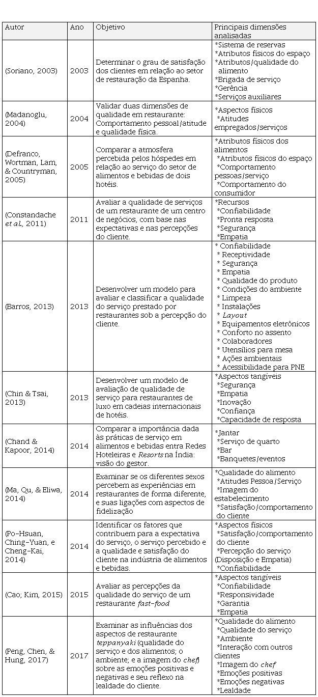 Embora a nomenclatura das dimensões seja pontualmente diferente, outros estudos analisados observaram também os atributos físicos dos restaurantes (Madanoglu, 2004; Barros, 2013; Ma, Qu . Eliwa, 2014), as atitudes dos prestadores de serviço e o serviço (Madanoglu, 2004; Defranco, Wortman, Lam . Countryman, 2005; Barros, 2013; Chand . Kappour, 2014; Ma, Qu . Eliwa, 2014), o comportamento e a satisfação do consumidor (Defranco, Wortman, Lam . Countryman, 2005; Barros, 2013; Ma, Qu . Eliwa, 2014) e a qualidade do alimento (Defranco, Wortman, Lam . Countryman, 2005; Barros, 2013; Chand . Kappour, 2014; Ma, Qu . Eliwa, 2014).