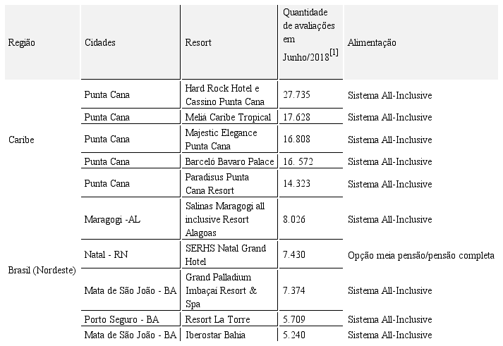 Etapa 1 - Seleção dos Resorts: Foram selecionados dez hotéis, classificados como resorts pelo site Tripadvisor, localizados em destinos de praia, sendo cinco do nordeste brasileiro e cinco da região do mar do Caribe. A escolha do site TripAdvisor se deve ao fato de que, segundo Spalding e Parrett (2019), é o maior site de viagens do mundo. A escolha dos locais se deu em função da semelhança de temperatura e clima destas regiões e para que fosse possível comparar dados nacionais aos estrangeiros. Para que o banco de dados fosse robusto, foram escolhidos os resorts que possuíam o maior número de OTRs e que dispusessem de um sistema de alimentação semelhante. Como pode ser visto no Quadro 2, os resorts operam no sistema all-inclusive, isto é, hospedagem, serviços, alimentação, bebidas e lazer, incluídos em um só pacote. O sistema pensão completa, neste caso, compreende café da manhã, almoço e jantar, além das bebidas não alcoólicas destas refeições, portanto semelhante ao all-inclusive. No Brasil, de acordo com Bonfato e Baltieri (2016), os resorts que operam all-inclusive estão localizados no nordeste do país.
