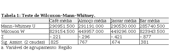 Para verificar se os dois grupos da amostra (resorts brasileiros e resorts caribenho) respondiam de forma diferente, ou seja, se existia diferença nas respostas de hóspedes no Brasil e hóspedes no Caribe, realizou o teste de Wilcoxon-Mann-Whitney.