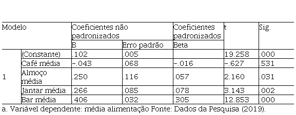 O resultado do teste ANOVA indicou que pelo menos uma das variáveis independentes (médias de café da manhã, almoço, jantar e bar) está influenciando a variável dependente (média alimentação), uma vez que o nível de significância (p) foi inferior a 0,0001. O resultado da análise de variância realizada por meio do teste ANOVA permitiu estimar os coeficientes de regressão, apresentados na Tabela 2(Hair et al., 2009, p. 72).