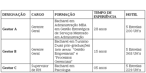Como técnica, elegeu-se a entrevista em profundidade, pois ela recolhe “respostas a partir da experiência subjetiva de uma fonte, selecionada por deter informações que se deseja conhecer” (Mendes & Paula, 2008, p.332). Neste contexto, a seleção dos participantes se deu pela amostragem não probabilística por conveniência, em que os pesquisadores selecionam os indivíduos mais acessíveis de uma população para compor suas amostras (Veal, 2011). Participaram três gestores (sendo dois gerentes gerais e uma supervisora de recursos humanos) ligados a renomados empreendimentos hoteleiros da zona sul e oeste do Rio de Janeiro, além de um representante do Ministério do Turismo. No que tange a seus perfis, o Quadro 01 evidencia suas descrições: