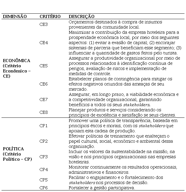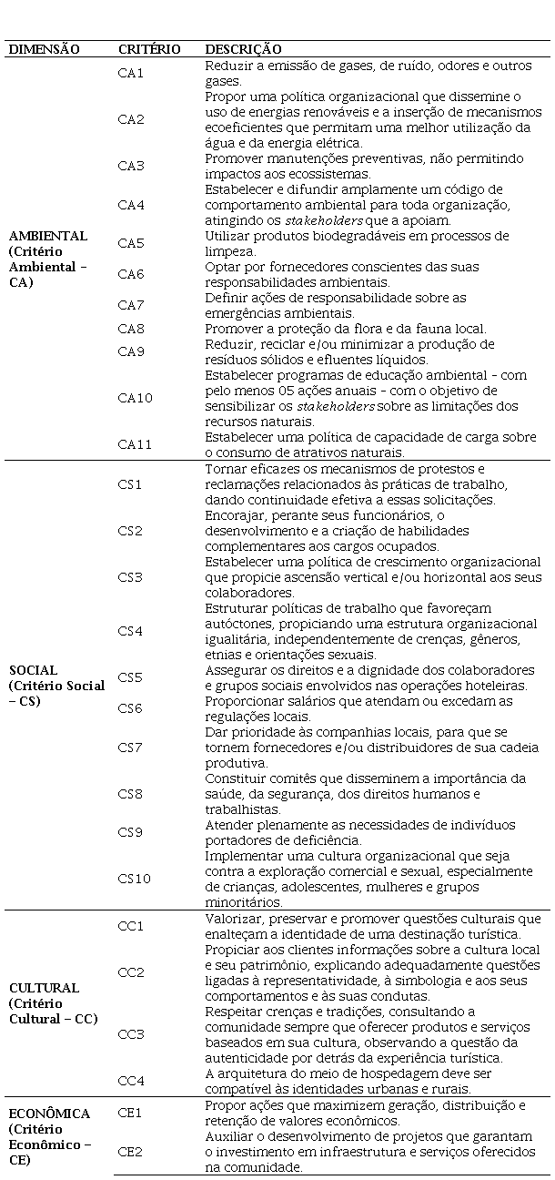 Em virtude disso, a partir de uma densa análise dos relatórios da UNEP (2003), UNEP e UNWTO (2005), Foundation for Environmental Education [FEE], UNEP e UNWTO (2006), Global Sustainable Tourism Council [GSTC] (2012) e Global Reporting Initiative [GRI] (2013), Santos (2018) elaborou 39 critérios – distribuídos nas dimensões ambiental (11), social (10), cultural (4), econômica (8) e política (7) – para orientar essas práticas hoteleiras (Amado dos Santos et al., 2020).