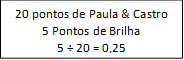 Se cada qualidade (“ótimo”, “bom”, “regular” e “ruim”) descrita por Paula & Castro (2014) podem ter 5 pontos no máximo e a escala crescente de Brilha (2005) vai de 1 (ruim) para 5 (ótimo), então teremos a equivalência de 0,25 ponto de Brilha (2005) para cada ponto de Paula & Castro (2014).
