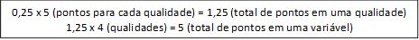 Portanto, Paula & Castro (2014) apontaram, em uma escala crescente, quatro qualidades – “ótimo”, “bom”, “regular” e “ruim” – definindo que cada uma dessas qualidades possa receber uma pontuação máxima de 5 pontos, o que somando-se às quatro qualidades (“ótimo”, “bom”, “regular” e “ruim”) de cada variável, a pontuação máxima para cada variável foi de 20 pontos.