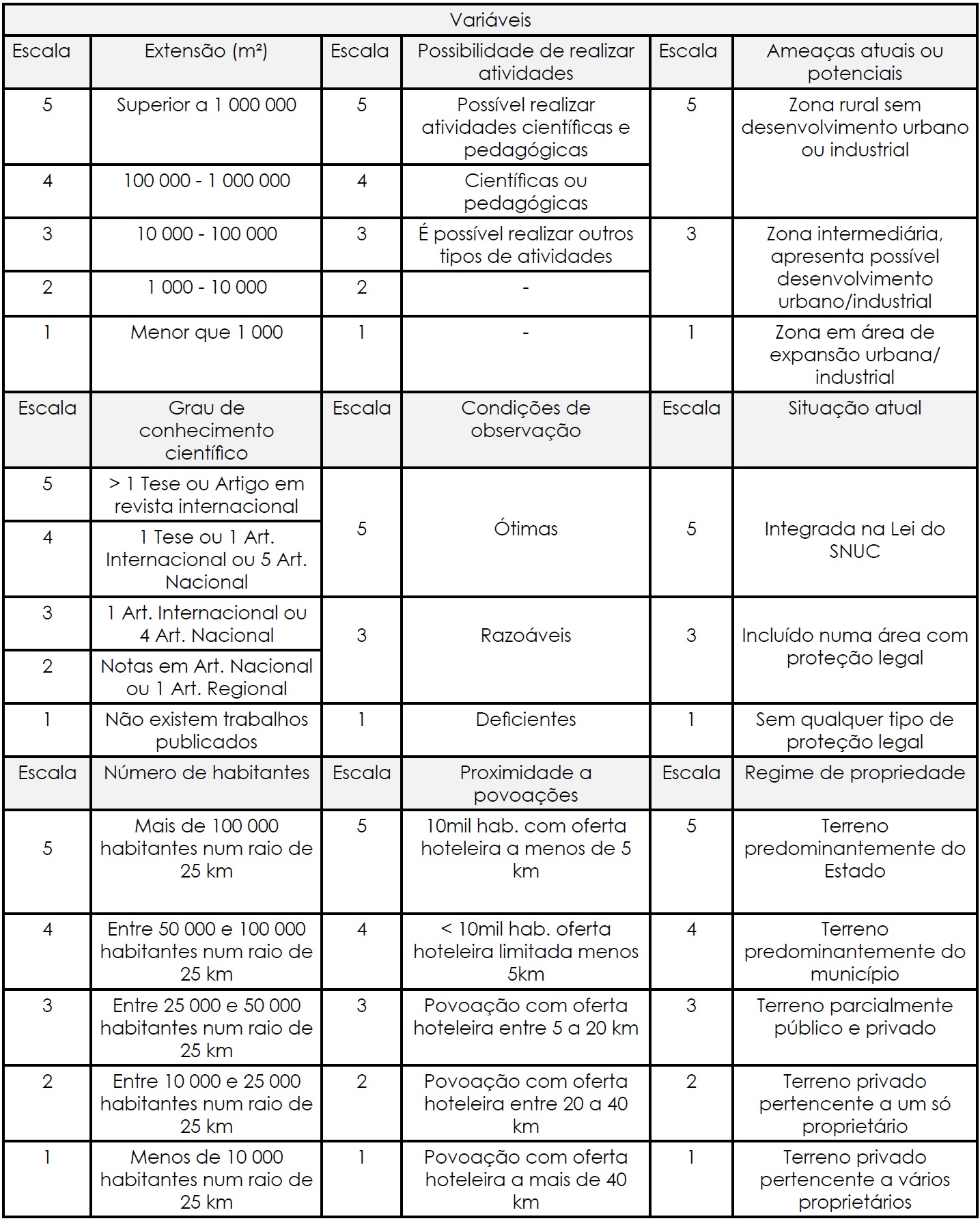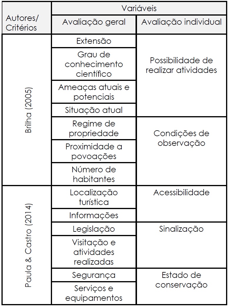 Do total de variáveis – que juntas somam-se 35, sendo 22 de Brilha (2005) e 13 de Paula & Castro (2014) – foram selecionadas 18, respectivamente nove de cada, conforme será demonstrado nos Quadros 1 e 2, a seguir. Para a escolha, houve complementaridade entre parte das variáveis selecionadas, a exemplo da relação Brilha/Paula e Castro: Possibilidade de realizar atividades/Visitação e atividades realizadas; Grau de conhecimento científico/Informações; Ameaças atuais ou potenciais/Estado de conservação; Condições de observação/Segurança; e Proximidade a povoações/Acessibilidade.