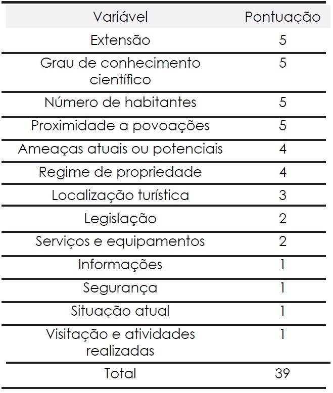 De maneira geral, das 13 variáveis analisadas (Tabela 1) pode-se afirmar que o parque obteve boa pontuação em quatro (Extensão, Grau de conhecimento científico, Número de habitantes e Proximidade a povoações); e outras quatro (Informações, Segurança, Situação atual, Visitação e atividades realizadas) tiveram pontuação muito baixa.