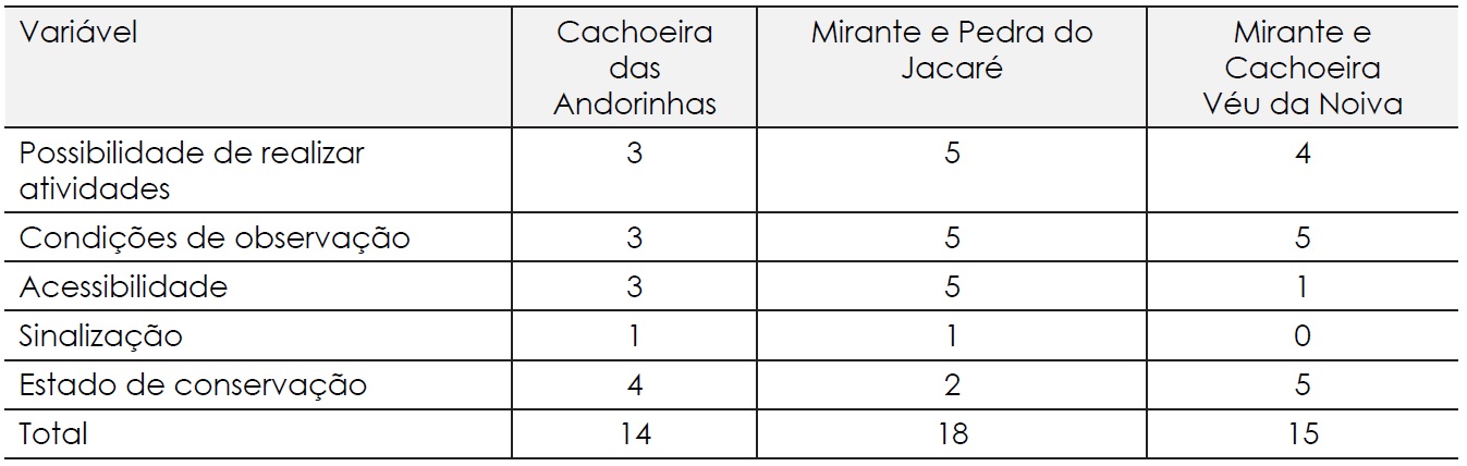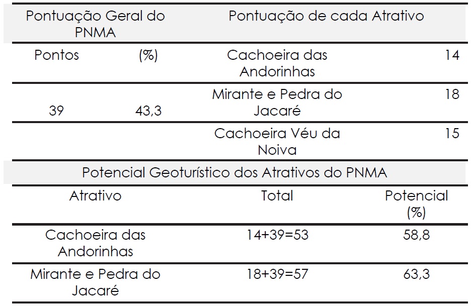 Ressalta-se, portanto, a importância do levantamento, valoração e divulgação de ações voltadas à geoconservação via potencial geoturístico do PNMA (Tabela 3).