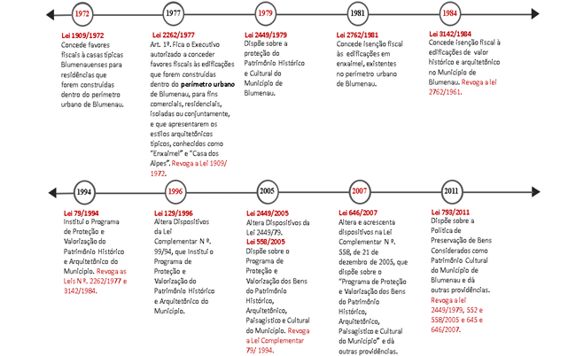 Diversas leis municipais foram elaboradas com o intuito de normatizar, disciplinar ou fomentar as construções características germânicas em Blumenau, tendo sido a primeira editada em 1972 e sistematicamente ampliada e/ou revogada por novas diretrizes, que tinham como base atender aos anseios da comunidade e disciplinar e hierarquizar as edificações consideradas de interesse patrimonial. Silva (2014) cita o trabalho de Siebert (2000) sobre o histórico de planejamento territorial e de construções nesta cidade: