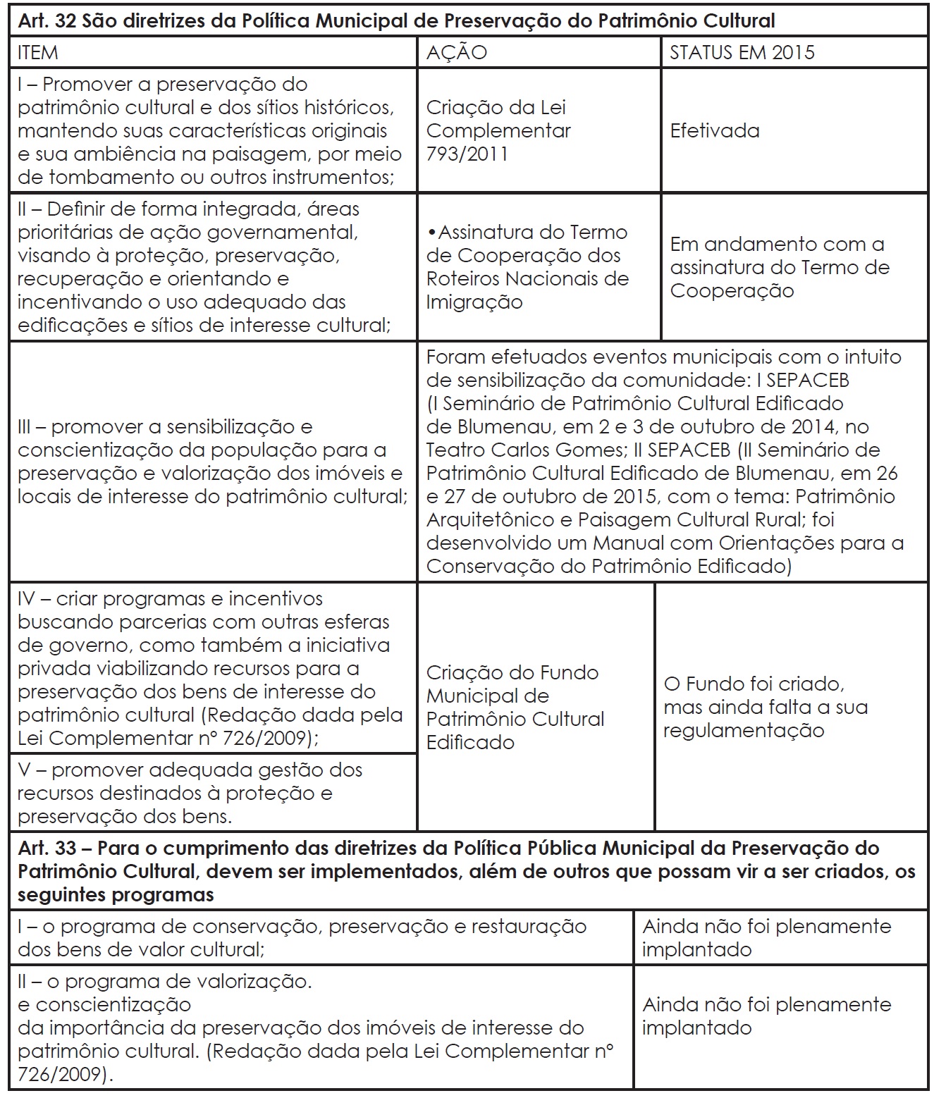 Em 2015, a Secretaria de Planejamento do município de Blumenau promoveu uma avaliação de itens e artigos desse Plano Diretor (Câmara Municipal de Blumenau, 2006). Assim, nos aspectos tangentes ao Patrimônio Cultural foram avaliados tais artigos, dando a sua atualização e os direcionamentos naquela altura (Quadro 1).