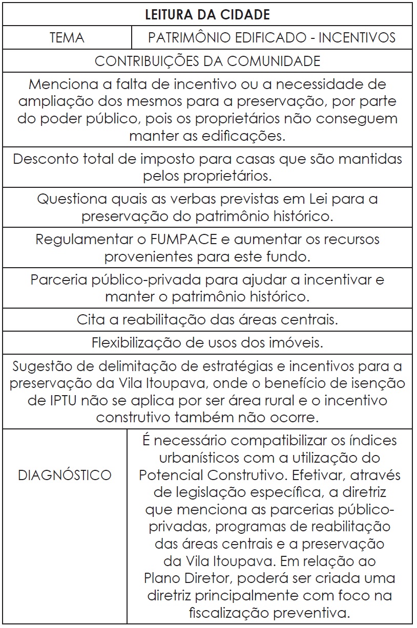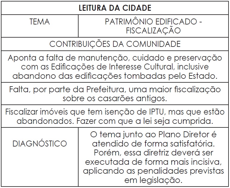 Nas contribuições da coletividade, no eixo 03, com o tema específico “Patrimônio Edificado”, houve a divisão em quatro subtemas: a) “Patrimônio Edificado - Fiscalização”; b) “Patrimônio Edificado - Incentivos”; c) “Patrimônio Edificado - Instrumentos”; d) “Patrimônio Edificado - Geral”, como segue: