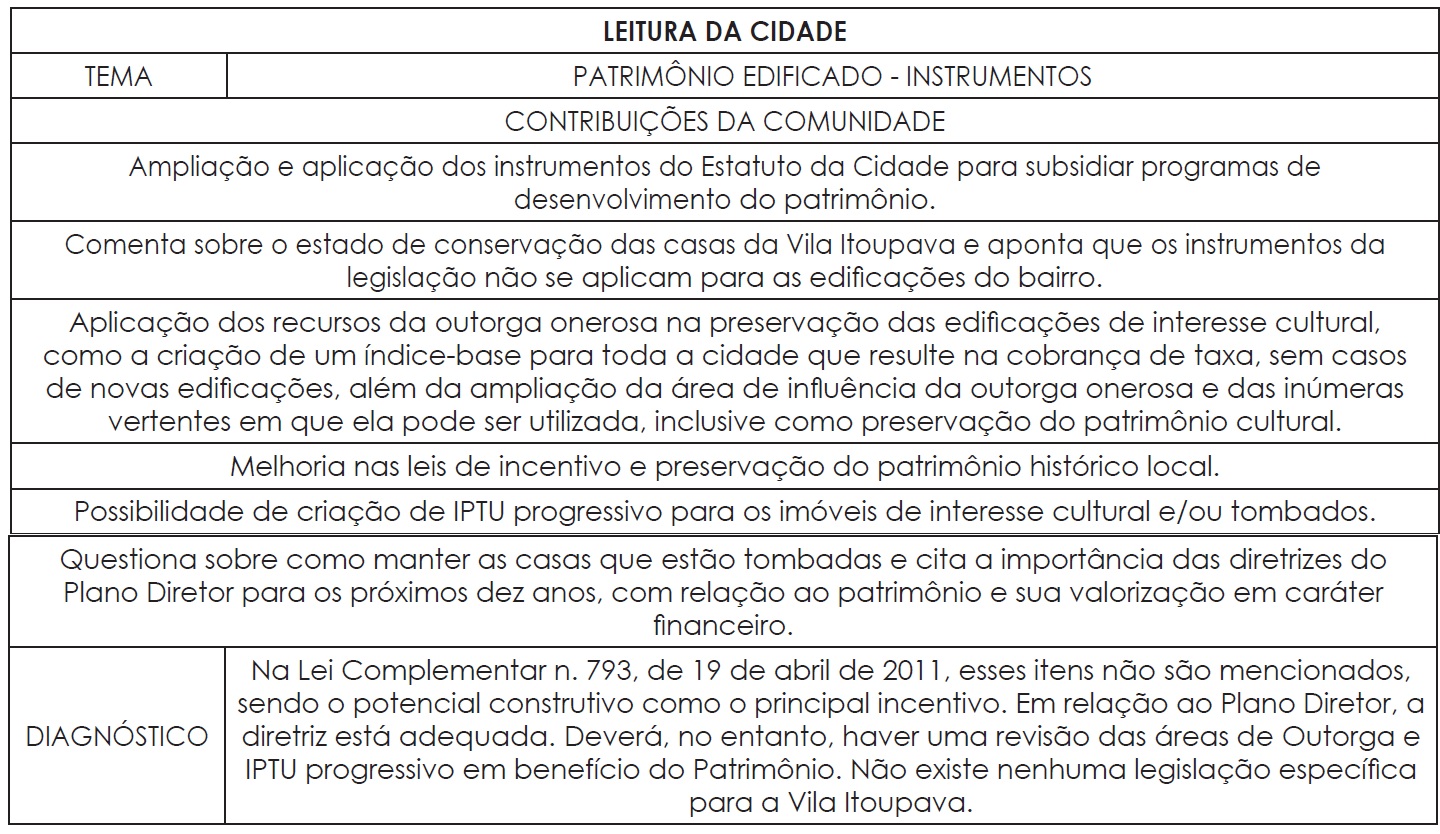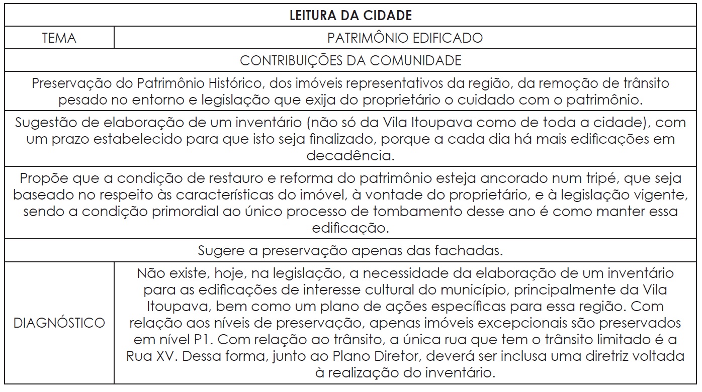 Pode-se apontar que a legislação aqui analisada teve preocupação efetiva em criar um arcabouço jurídico e ordenativo municipal (órgãos, conselho e autarquias) que atuam para o propósito patrimonial. No entanto, a descontinuidade ou a falta de um empenho contínuo produziu uma série de instrumentos legais e que, na sua operacionalização, ampla e complexa, não conseguem apresentar um corpus unificado para a oferta do Patrimônio Edificado para o Turismo, contribuindo, nessa seara burocrática e legal, para o aumento do descaso com o patrimônio. Destaca-se, nesse aspecto, um excerto do “Diagnóstico” sobre o Patrimônio Edificado, relatado no Caderno 1–Leitura da Cidade na Revisão do Plano Diretor, de SEPLAN (2016) e reproduzido neste trabalho na Quadro 5: “Não existe hoje na legislação a necessidade da elaboração de um inventário para as edificações de interesse cultural do município, principalmente da Vila Itoupava, bem como um plano de ações específicas para esta região. Com relação aos níveis de preservação, apenas imóveis excepcionais são preservados em nível P1”.