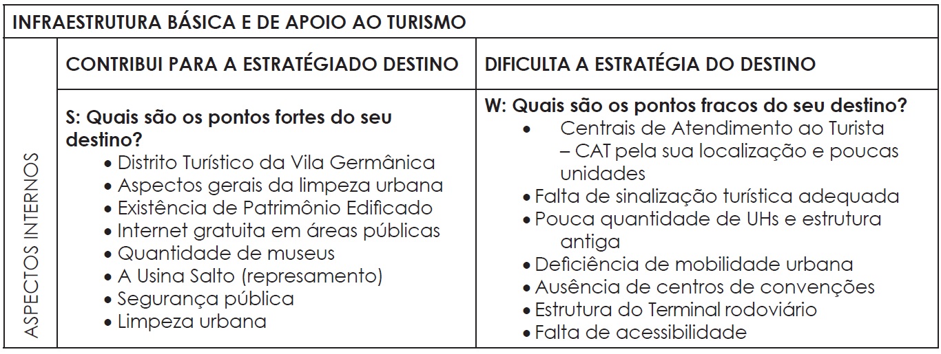 A preocupação com o Patrimônio Cultural Edificado é apresentada somente quando se trata de “Infraestrutura Básica e de Apoio ao Turismo” (Quadro 6), dando como um dos aspectos que contribuem para a estratégia de Blumenau como destino turístico. Também é apresentado como um “Produto Turístico”.
