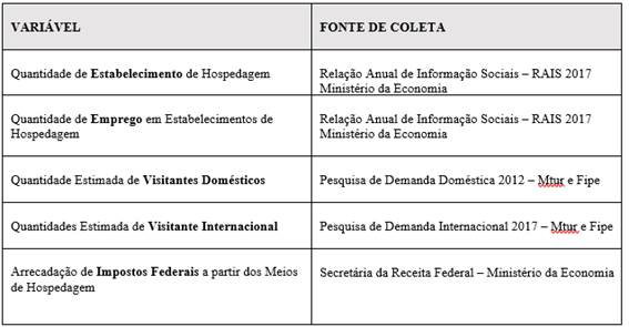 No ano de 2019, houve uma revisão da metodologia empregada e da coleta de informações atualizadas, nas quais foi introduzida a variável arrecadação de impostos federais dos meios de hospedagem como forma de complementar os indicadores já utilizados, agregando uma variável de desempenho financeiro para a análise (Quadro 1). A partir daí, chegou-se a cinco variáveis, que foram cruzadas em uma análise de cluster e deram origem a cinco categorias de municípios (A, B, C, D e E).