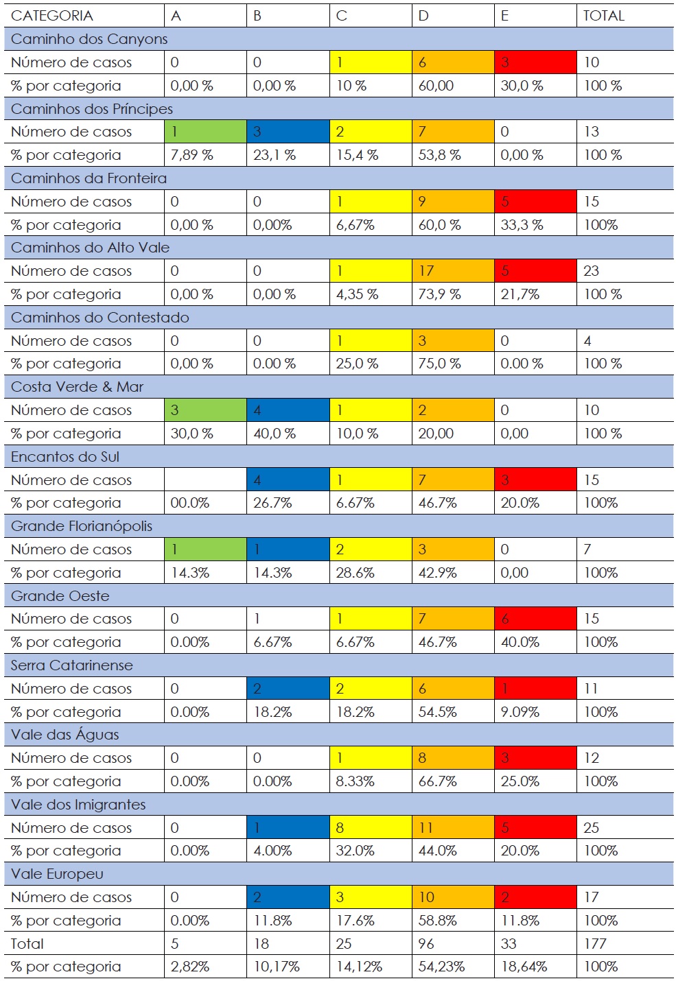 Na relação entre região e categorização dos municípios, a categoria A tem um município em Caminhos dos Príncipes, três na Costa Verde & Mar, e um na Grande Florianópolis. Estes municípios estão todos situados no Litoral, e associam turismo de praia e turismo de negócios. A categoria B tem 18 municípios em oito regiões turísticas. Nas demais categorias, há 25 municípios na categoria C, 103 na categoria D e, na categoria E, constam 31 municípios. Fica evidenciado que as categorias que expressam melhor qualificação estão em número reduzido e as categorias D e E concentram 131 municípios, totalizando 72,87% dos municípios cadastrados no Mapa do Turismo Brasileiro. A preponderância dos dados das regiões D e E sinalizam que, para obter um turismo de melhor qualidade de oferta e infraestrutura, os processos estratégicos da região para viabilizar o turismo consistente estão longe de serem alcançados numa grande parcela dos municípios catarinenses.