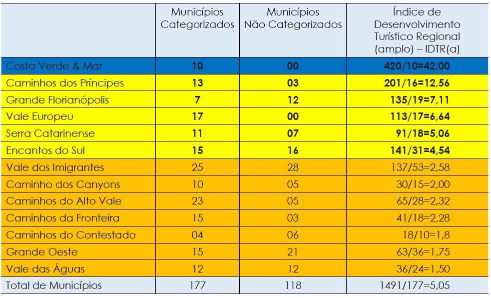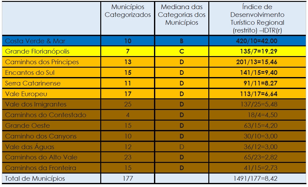 O IDTR(a) reconheceu a Costa Verde e Mar (42) como Destino Consolidado e as regiões Grande Florianópolis (12,56), Caminho dos Príncipes (7,11), Vale Europeu (6,648), Serra Catarinense (5,06), Encantos do Sul (4,54) como Destino em Consolidação; as demais regiões foram reconhecidas como Destino não Consolidado, a saber: Vale dos Imigrantes (2,58), Caminhos do Alto Vale (2,32), Caminhos da Fronteira (2,28), Caminho dos Canyons (2) Caminhos do Contestado (1,8), Grande Oeste (1,75) e Vale das Águas (1,50) reconhecendo uma média Geral de 5,05 ( Tabela 02).