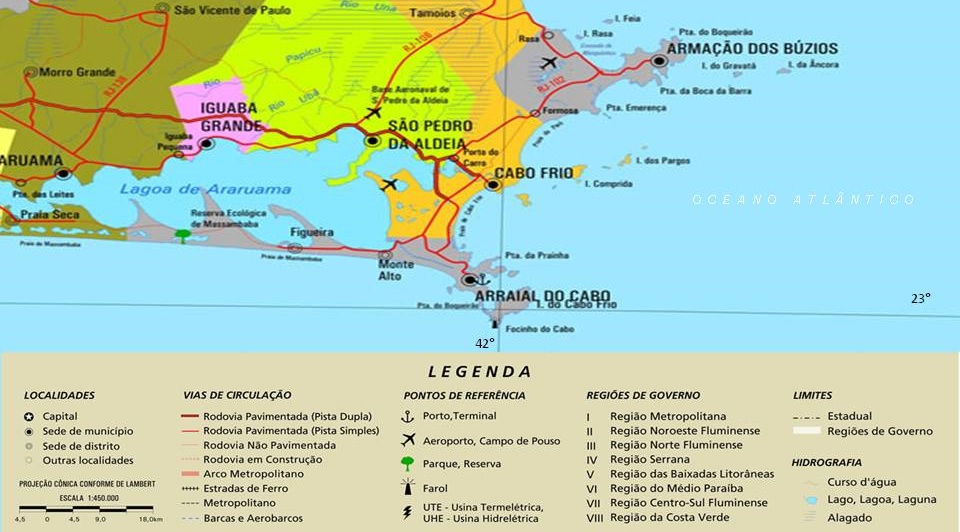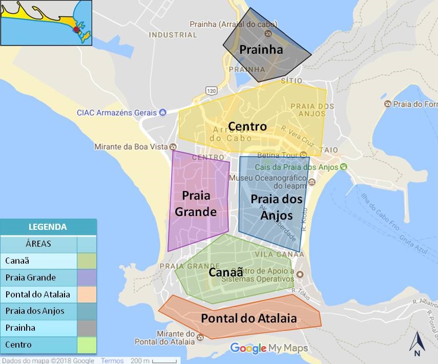 Arraial do Cabo foi escolhido para a pesquisa dada sua importância no turismo no estado do Rio de Janeiro, pela sua dimensão territorial reduzida (o que facilitou a aplicação da metodologia exploratória) e pelo interesse pessoal dos autores. O município pertence à região turística da Costa do Sol, limitando-se ao norte com Cabo Frio, a leste e a sul com o Oceano Atlântico e a oeste com Araruama (Figura 4). Sua área terrestre é de 160,287 km², onde vivem cerca de 30.500 habitantes (Instituto Brasileiro de Geografia e Estatística [IBGE], 2021).
