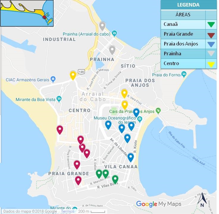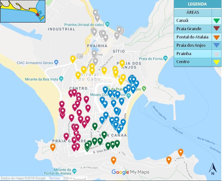 Posteriormente, os meios de hospedagem foram mapeados seguindo as áreas propostas na Figura 1: Canaã (11), Praia dos Anjos (32), Centro (14), Monte Alto/Figueira (3), Praia Grande (25), Pontal do Atalaia (3) e Prainha (14) - (Figura 2).