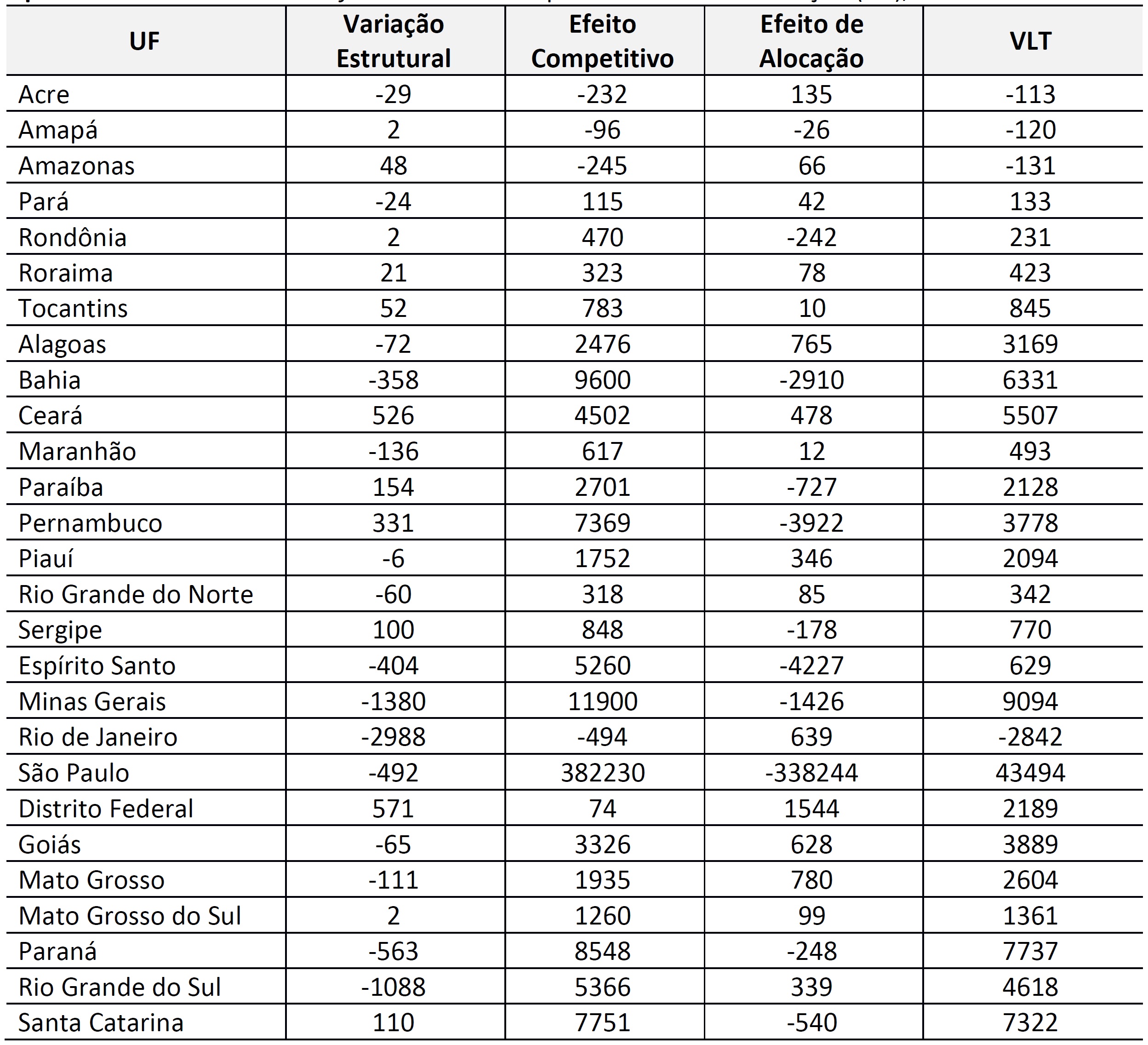 O componente estrutural (E) refere-se ao quantitativo adicional de empregos obtidos por uma região proveniente da sua composição estrutural. Quando a variação desse componente (ou efeito) é positiva, significa que a estrutura produtiva regional possui setores mais dinâmicos, o que contribui para o aumento das possibilidades de tornar-se especializada nesses setores (Rosa et al., 2004). Ou seja, se o estado possui na sua estrutura produtiva ACTs em que o emprego cresce a taxa superiores à nacional, o efeito estrutural será positivo. Já uma variação diferencial (D) positiva significa que a taxa de crescimento de uma ACT foi maior, em média, em um determinado estado do que no país.