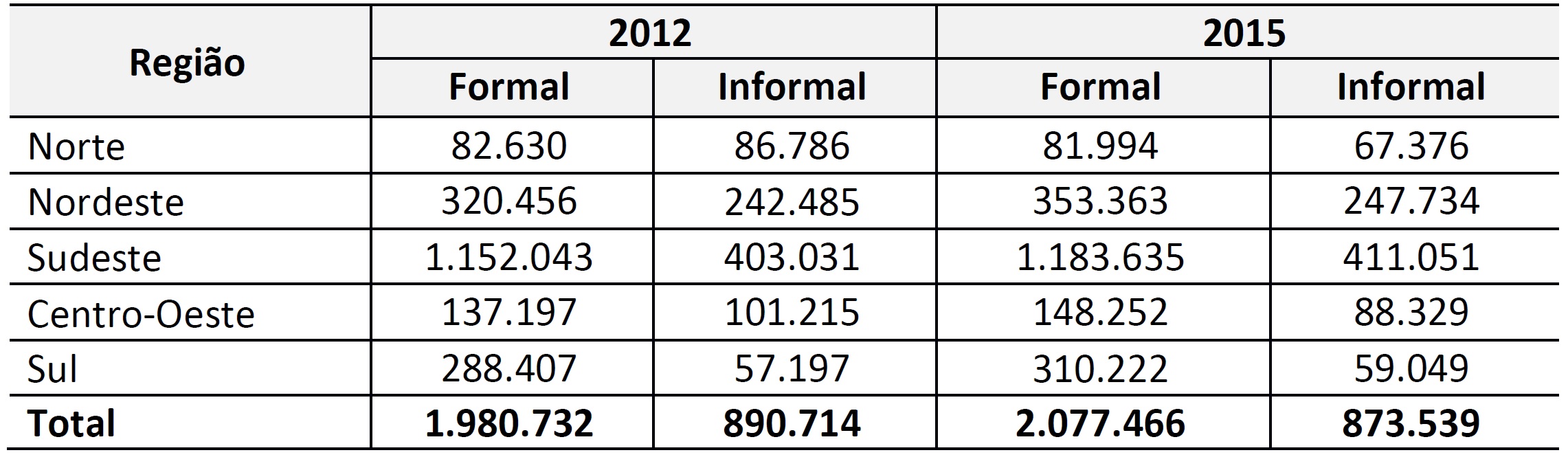 Com relação ao mercado de trabalho do setor turístico brasileiro, de acordo com informações do Instituto de Pesquisa Econômica Aplicada (IPEA), em 2015, o número de ocupações ligadas às atividades turísticas no Brasil era de 2.951.006 (ver Apêndice 3), sendo que, deste total, 70% correspondia ao mercado de trabalho formal e 30% aos empregos informais. Ou seja, a informalidade no setor turístico é significativa. Entretanto, para avaliar o grau de especialização e realizar a decomposição do crescimento do emprego, são utilizados apenas os dados formais, dada a não disponibilização dos dados informais a nível estadual, bem como sua defasagem temporal.