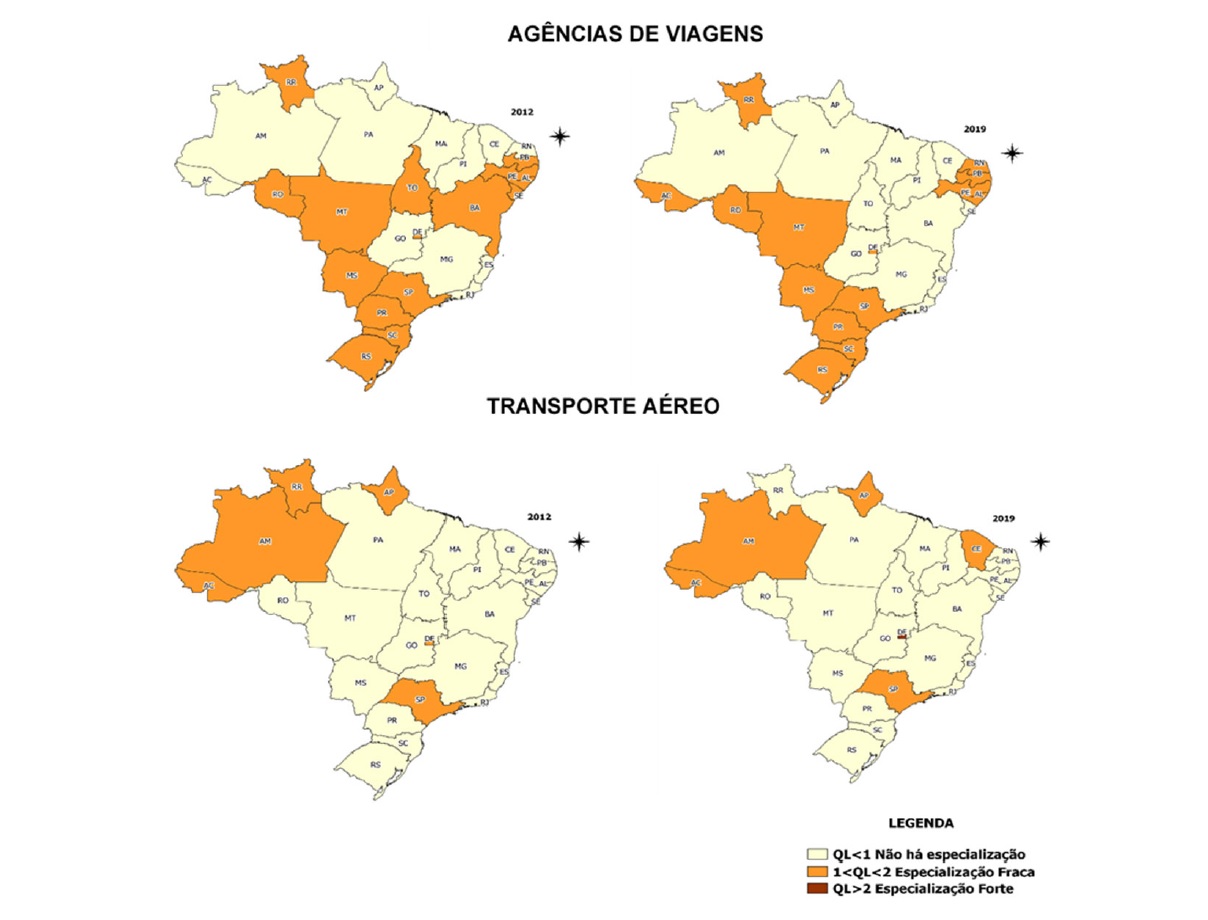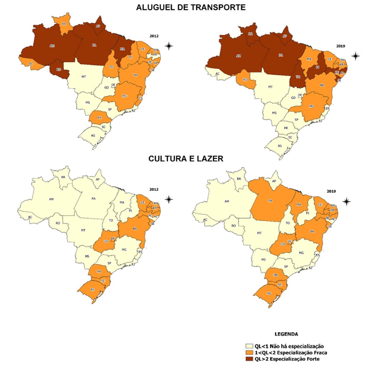 Para a atividade Cultura e Lazer, em 2012, os estados do Sul, da região Nordeste (exceto Alagoas, Piauí e Maranhão), juntamente com Goiás e Distrito Federal apresentaram especialização fraca e os demais estados não obtiveram especialização. Em 2019, esses estados mantiveram o nível de especialização; o Pará e o Maranhão tornaram-se especializados na atividade Cultura e Lazer, e os demais não apresentaram especialização.