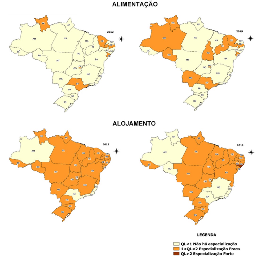 Em 2019, houve uma mudança significativa no padrão de especialização dessa atividade; além das regiões já especializadas manterem seu nível de especialização, os estados do Piauí, Tocantins, Mato Grosso do Sul, Rondônia e Amazonas também se tornaram especializados neste segmento. Já para atividade de Alojamento, não houve mudanças significativas entre 2012 e 2019. Todavia, vale destacar o estado de Alagoas que, em 2019, tornou-se o único estado brasileiro fortemente especializado nessa atividade.