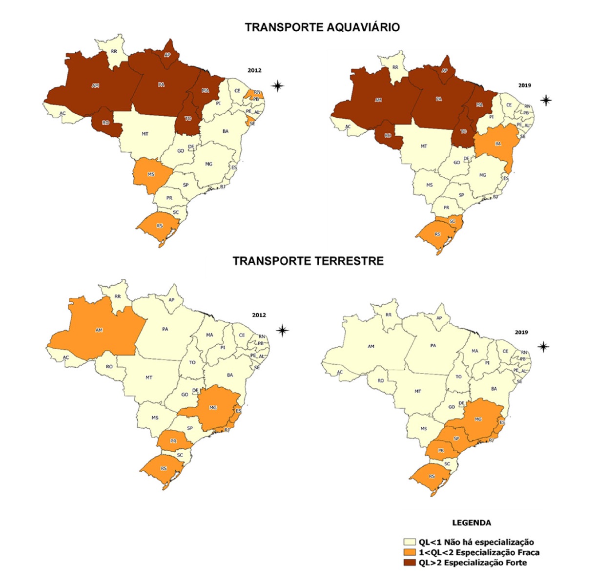 No Transporte terrestre, em 2012, observou-se especilização, apenas, no Amazonas e em estados da região Sul e Sudeste. Todavia, em 2019, verificou-se um nível de especialização somente em estados das regiões Sul e Sudeste. Nos demais estados não foi identificado, no período analisado, nenhum nível de especialização nesse segmento.