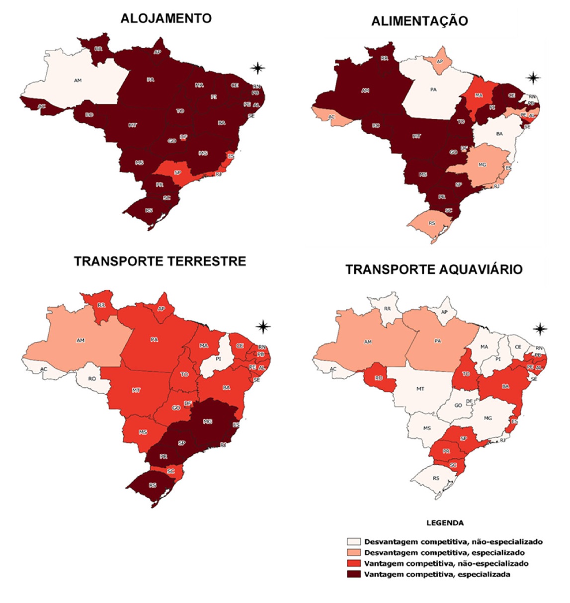 Na ACT Transporte Terrestre, 4 dos 9 estados do Nordeste não possuem vantagens competitivas e não são especializados. Amapá, Pará, Maranhão, Ceará, Rio Grande do Norte, Sergipe, Bahia, Tocantins, Goiás, Distrito Federal, Mato Grosso do Sul e Santa Catarina aparecem com vantagens competitivas, mas sem especialização. Os estados de Minas Gerais, Espírito Santo, São Paulo, Paraná, Rio Grande do Sul e Amazonas apresentaram vantagens competitivas e especializadas. É importante destacar que esta ACT, juntamente com Alimentação, é considerada atividade estratégica, em virtude do nível de encadeamento dessas atividades, com outras atividades econômicas. Em outras palavras, o desenvolvimento dessas atividades induz ao crescimento de outros setores (Takasago & Mollo, 2010). Transporte aquaviário mostrou-se a atividade mais incipiente, uma vez que esta ACT não foi especializada nem competitiva na maioria dos estados brasileiros. Uma possível explicação para este resultado pode ter relação com a característica do turismo brasileiro, que tem como principais “portas” de entrada os aeroportos e os terminais rodoviários.