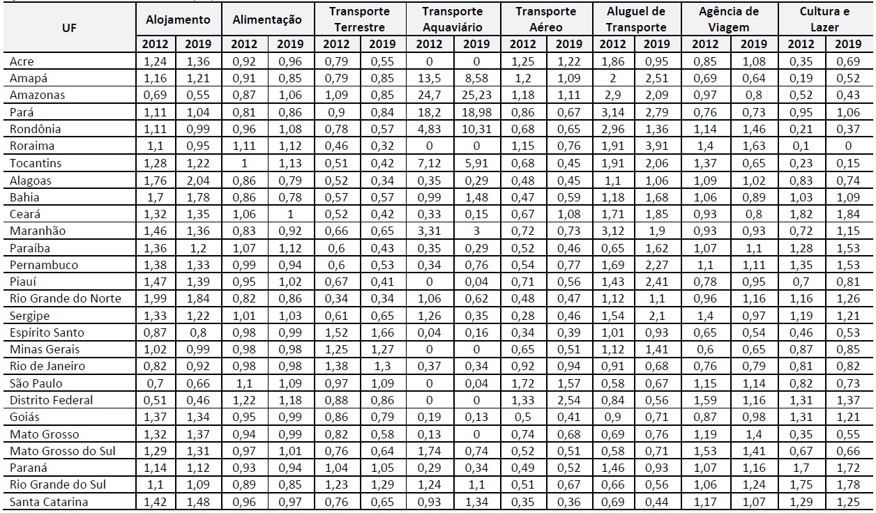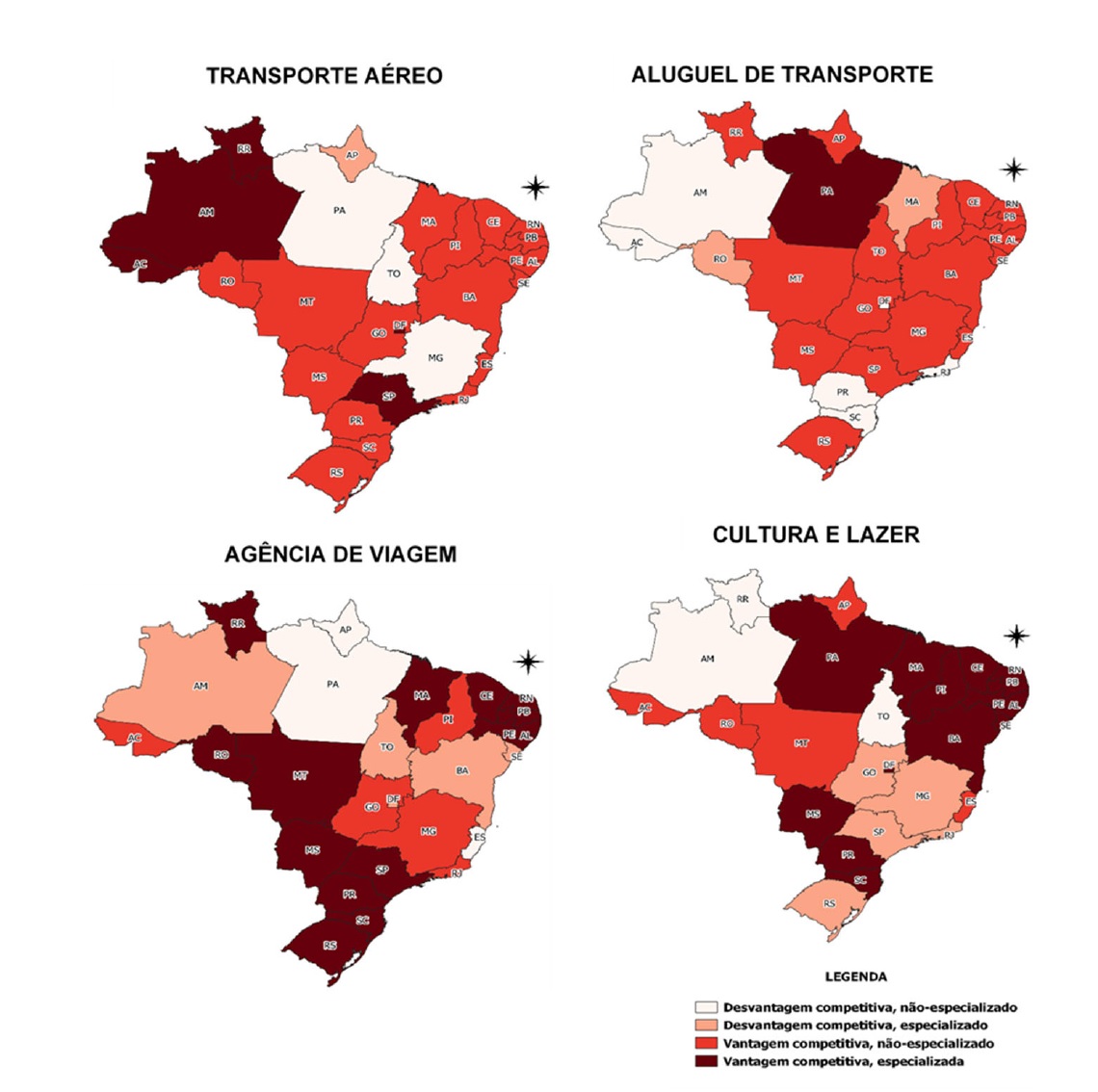 Diante disso, este artigo tem por objetivo medir o grau de especialização e decompor o crescimento das Atividades Características do Turismo (ACTs) no Brasil. Com o intuito de analisar a localização e o desempenho do emprego nos estados brasileiros nos anos 2012 e 2019, foi utilizado o Quociente Locacional (QL), que revela o grau de especialização de cada atividade em cada estado frente à estrutura de ocupação de mão de obra do Brasil. Na sequência, foi utilizado o método shift-share, destacando o efeito alocação, cujo objetivo é qualificar as ACTs quanto às vantagens e desvantagens competitivas e identificar se determinada ACT é mais especializada em alguns estados do que em outros. De maneira complementar, é realizada um analise descritiva da variação mensal do volume das atividades turísticas, em 2020, com o objetivo de verificar o impacto da pandemia da COVID-19 sobre o setor. Ao longo do trabalho, buscou-se responder ao seguinte problema de pesquisa: Será que dentre as ACTs, a nível estadual, existe alguma que é mais desenvolvida e especializada?