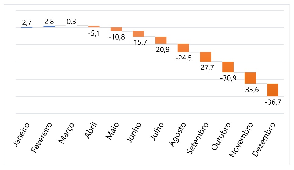 A Organização Mundial da Saúde decretou a Covid-19 como pandemia no mês de março de 2020. Percebe-se claramente que, a partir deste mês, o resultado acumulado do volume das atividades turísticas já sofre retração, conforme mostra a Figura 7.