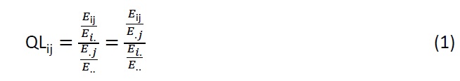O Quociente Locacional é de natureza setorial e se preocupa com o grau de especialização dos setores entre as regiões, ou seja, procura identificar padrões de concentração ou dispersão do número de empregados num determinado período (Piacenti et al., 2008). Para a construção do QL, têm-se as seguintes variáveis: