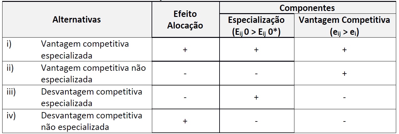 O efeito alocação mostra se a região j está especializada no setor para o qual possui vantagens competitivas. Assim, de acordo com o modelo proposto, uma região pode ter uma “vantagem competitiva” ou uma “desvantagem” e pode ser “especializada” ou “não especializada” em determinado setor (Sobral et al., 2006).