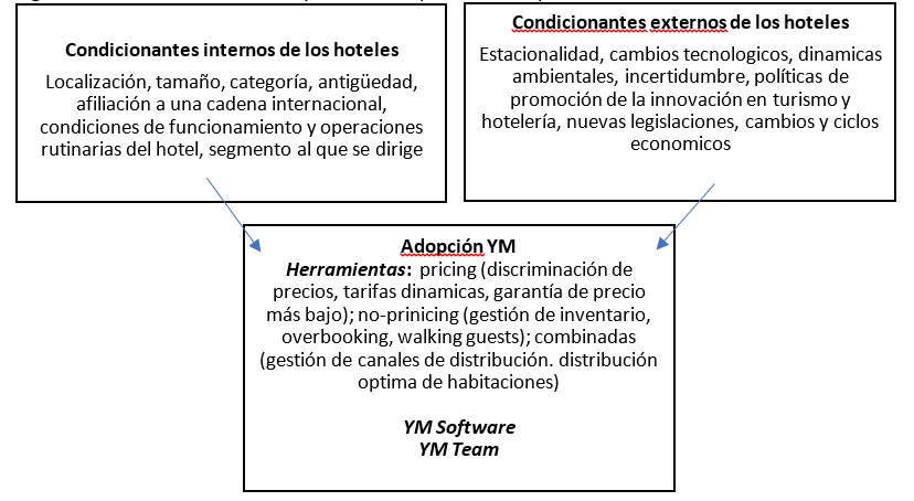 En cuanto a los factores que inciden en la adopción del YM, la literatura sobre innovación en hoteles ofrece un primer esquema para su análisis. Siguiendo Orfila-Sintes (2003 y 2009) y Martínez-Ros y Orfila-Sintes (2009), los determinantes de la innovación en hotelería pueden clasificarse en: 1) factores asociados a las características del hotel como su capacidad física o tamaño, la estructura de la propiedad y el grado de dependencia de otras estructuras organizativas, la modalidad de gestión del hotel y los servicios adicionales que presta; 2) factores asociados a las características de la demanda y la comercialización de los servicios, tales como el motivo del viaje de los huéspedes, la estacionalidad y el grado de uso de las instalaciones, los canales utilizados para reservar habitaciones y 3) la estrategia de mercado en relación a la diferenciación de los servicios respecto a los competidores. A estos determinantes se suma el conocimiento y las habilidades de los empleados, considerado fuente clave de innovación para los hoteles (Nieves et al., 2014; Nieves y Segarra-Ciprés, 2015; Dhar, 2015; Ottenbacher y Harrington, 2010).