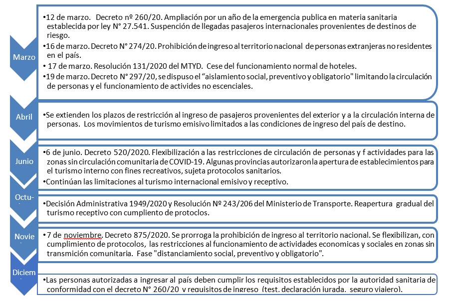 A mediados de marzo de 2020, tras la caracterización del COVID-19 como pandemia por parte de la Organización Mundial de la Salud y de forma un poco más tardía respecto a países de Europa, América del Norte y Asia, en Argentina se dispusieron un conjunto de medidas restrictivas a la circulación interna de personas, el ingreso de pasajeros desde el exterior y el funcionamiento de actividades no esenciales. La Figura 2 señala las principales medidas adoptadas, las cuales dan cuenta de una extensión de casi 9 meses durante el año 2020 de la vigencia de limitaciones al normal funcionamiento del sector turístico tanto interno como internacional.