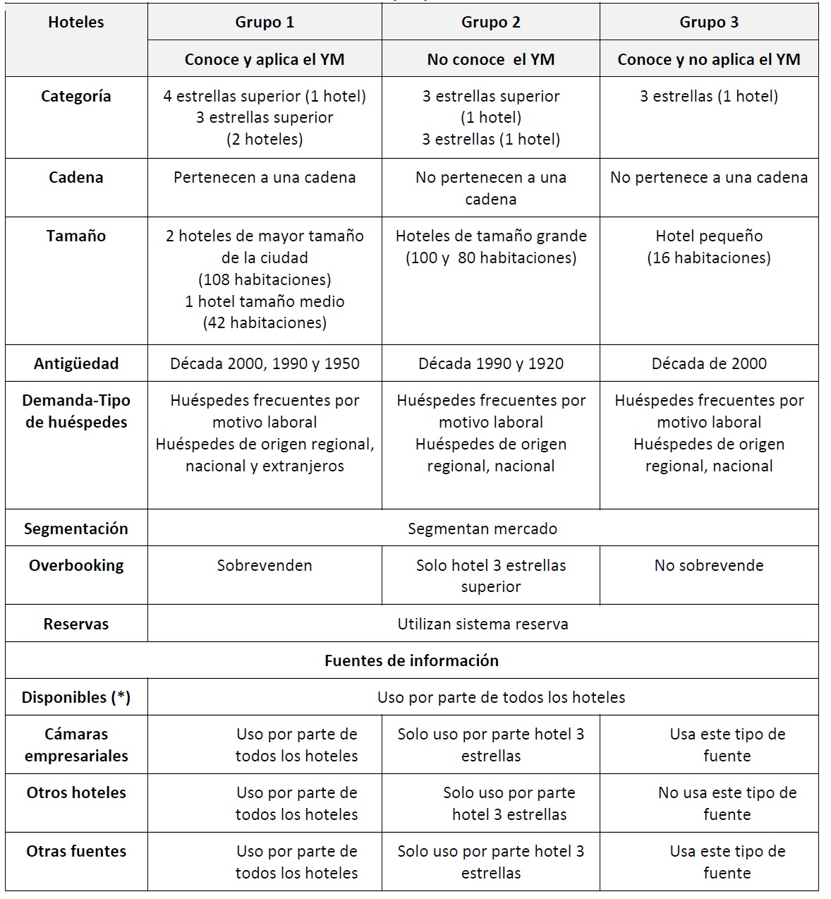 La información primaria recopilada con anterioridad a la crisis COVID-19, permitió agrupar a los hoteles de 3 y 4 estrellas de la ciudad según su conocimiento y aplicación efectiva del YM para la fijación de tarifas (Tabla 2). De este modo, se identificó un primer grupo, conformado por tres hoteles de categoría 3 y 4 estrellas superior y pertenecientes a una cadena, los cuales declararon tener conocimiento sobre el término y definición de YM e implementar esta filosofía de gestión. En el extremo opuesto, se delimitó un segundo grupo conformado por tres hoteles de categoría 3 estrellas y 3 estrellas superior, y no afiliados a una cadena. Estos hoteles declararon no conocer el sistema de gestión de ingresos bajo estudio, y por lo tanto tampoco aplicarlo. Asimismo, se identificó un hotel pequeño, de 3 estrellas y no perteneciente a una cadena, cuyo entrevistado expresó que el hotel tiene conocimiento sobre el YM, aunque no la aplica.