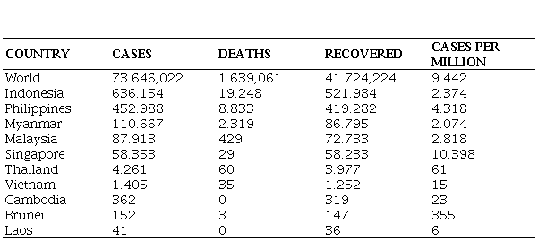 As of the time of writing (December 2020), the region has so far had 1.352,296 confirmed cases with 1.164,758 people recovered and 30.959 deaths (CSIS, 2020) (Table 1).