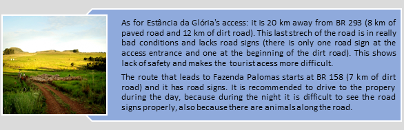 Due to the lack of maintenance of the roads, the owner of Estância da Glória has major complaints about the access conditions of his property, since this neglect makes access difficult, leading to the decrease of guests at some periods of the year because the road causes damages to the vehicles. Hence, the financial losses are also remarkable.