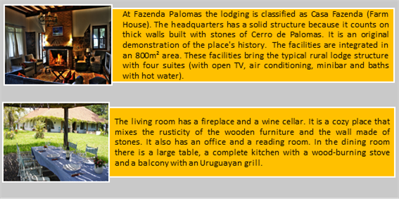 By its turn, Fazenda Palomas was founded in 1897. It is located at Vila Pampeiro, in the rural area of Santana do Livramento. It is a family business which is currently managed by the fourth generation of the same family. Its engagement with rural tourism began in 1995 with the current owner Atilio Ibargoyen. The Farm works with different activities - it works mainly with beef cattle, sheep farming, and horse breeding. Therefore, rural tourism was eventually implemented as an auxiliary income complement to other activities. Fazenda Palomas also offers lodging for tourists, from Thursday to Sunday, only by previously booked reservations. After some time, Fazenda Palomas started to operate during the holidays, and the period may not be from Thursday to Sunday.