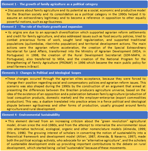 Historically, the concept of pluriactivity emerged in France during the 1980s with the agricultural policy redirection, which was a result of the agricultural overproduction crisis in the 1970s. However, in Brazil, this process occurred differently. It happened during the period of re-democratization (the 1980s) as a result of the rural workers’ social struggles and the conservative modernization model legitimacy crisis. This way, the debate about the viability of small family farms reemerged strongly, especially with the creation of the National Program for the Strengthening of Family Agriculture (PRONAF, in Portuguese) and with the constitution and consolidation of the concept of family farming.