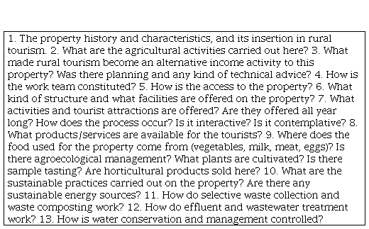 The script used during the interviews was based on the literature review (Table 2) of Azevedo and Rodrigues (2015), Bidarte and Pinto (2021), Blanco (2004), Brazil (2004, 2007, 2010), Caliari et al. (2016), Carvalho, Lima and Kastenholz (2014), Cipolat et al. (2019), Dias (2003), Graziano da Silva, Grossi and Campanhola (2002), Kageyama (2004), Machado (2005), Marques and Santos (2014)Peréz (2013) and Schneider (2003, 2010).